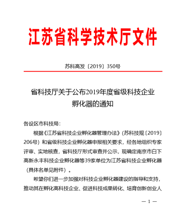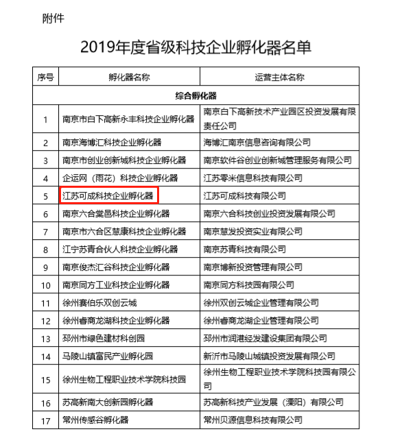 2017年12月,江蘇可成科技企業(yè)孵化器被認(rèn)定為南京市科技企業(yè)孵化器。